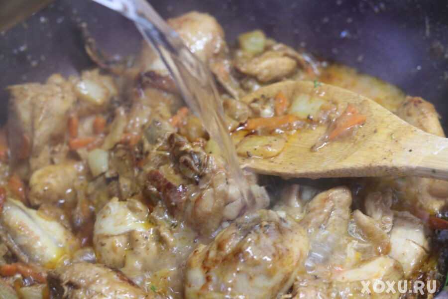 7. Залейте ингредиенты водой, закройте крышку казана и томите блюдо один час до готовности.