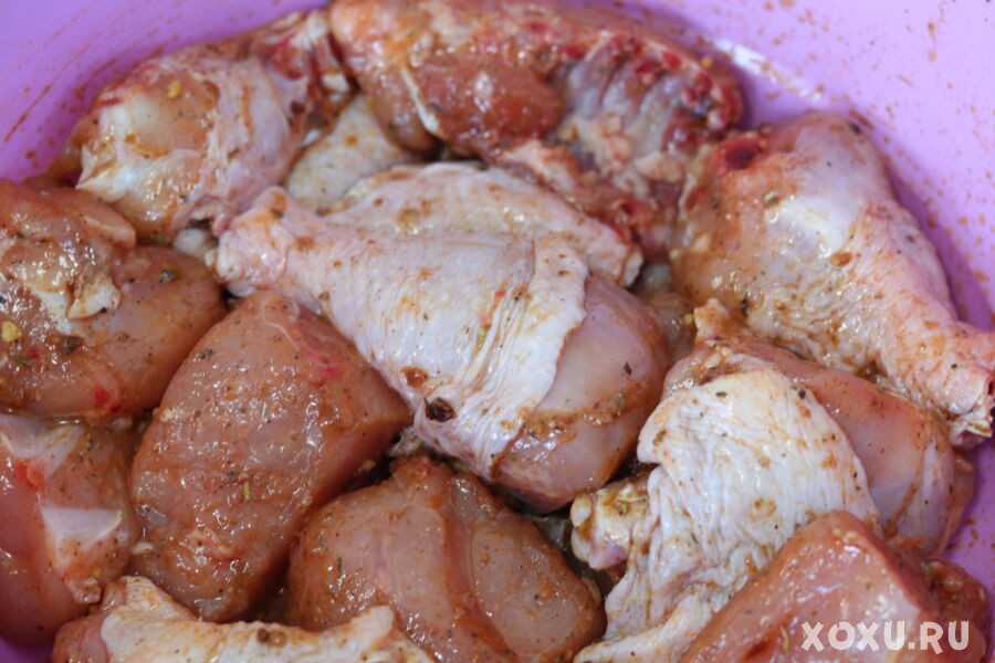 - Соль и приправы смешайте с уксусом, полейте мясо и перемешайте руками, чтобы приправы покрыли каждый кусок.