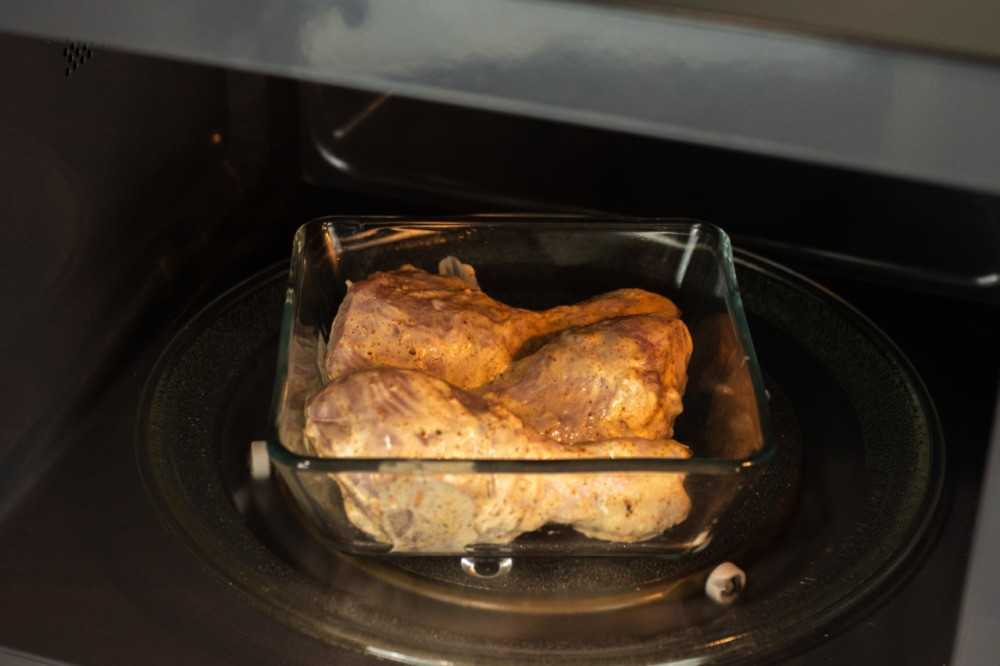 - Курицу нарежьте небольшими кусочками и положите в микроволновку в глубокую емкость.