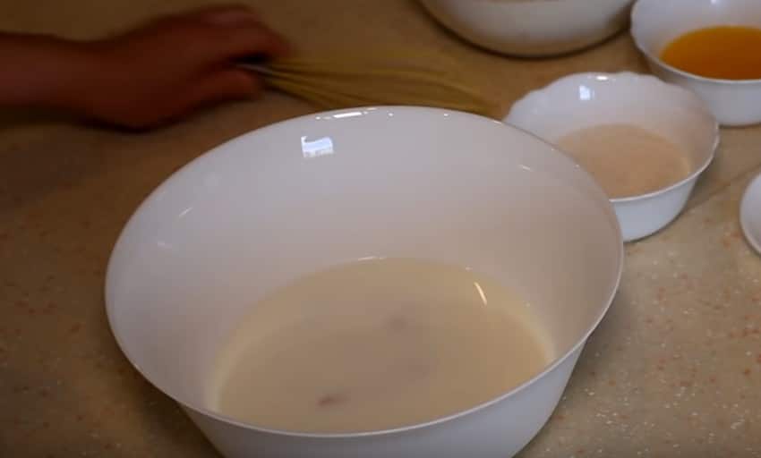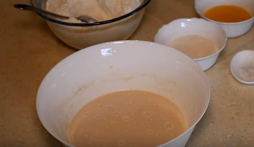 - Вылить в глубокую посуду чашку теплого молока, разболтать в нем дрожжи, развести сахар, муку (по столовой ложке), поставить в тепло.