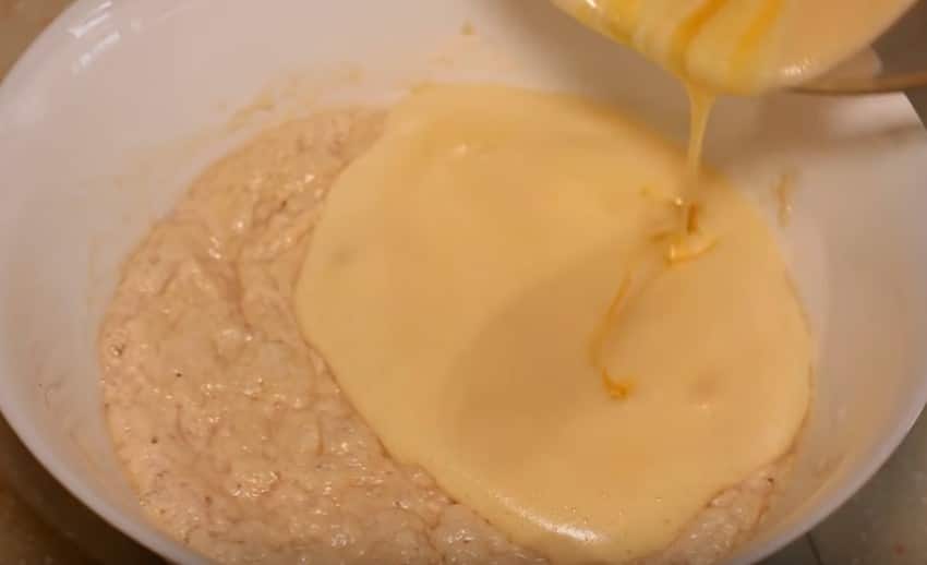 - Еще час спустя положить оставшуюся муку, сахар, взбитые венчиком яйца, растительное и сливочное масло.