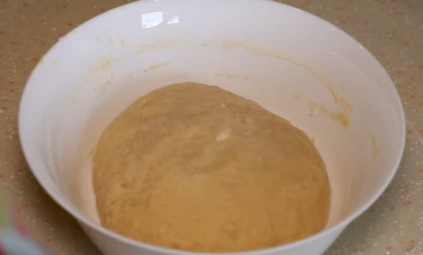Если же все прошло хорошо и переделывать тесто нет необходимости, можно двигаться дальше. В миску с поднявшимися дрожжами добавьте сахар, соль и то молоко, что осталось после приготовления начинки. Далее введите в смесь растопленное сливочное масло и сюда же разбейте два яйца. Вернее, одно яйцо и белок от второго – один желток предварительно отделите и уберите в сторонку, его мы впоследствии будем использовать, чтобы смазывать выпечку при выпекании. Когда все сделаете, смешайте ингредиенты еще с половиной муки и оставьте тесто на 20-25 минут, чтобы оно поднялось.