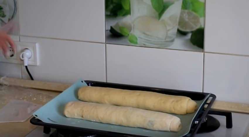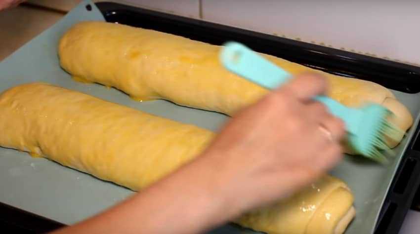 Сверните колбаску, загнув его концы, чтобы начинка не вытекла при выпекании. Выложите его на противень, смазанный растительным маслом. Все то же самое проделайте и со второй заготовкой.