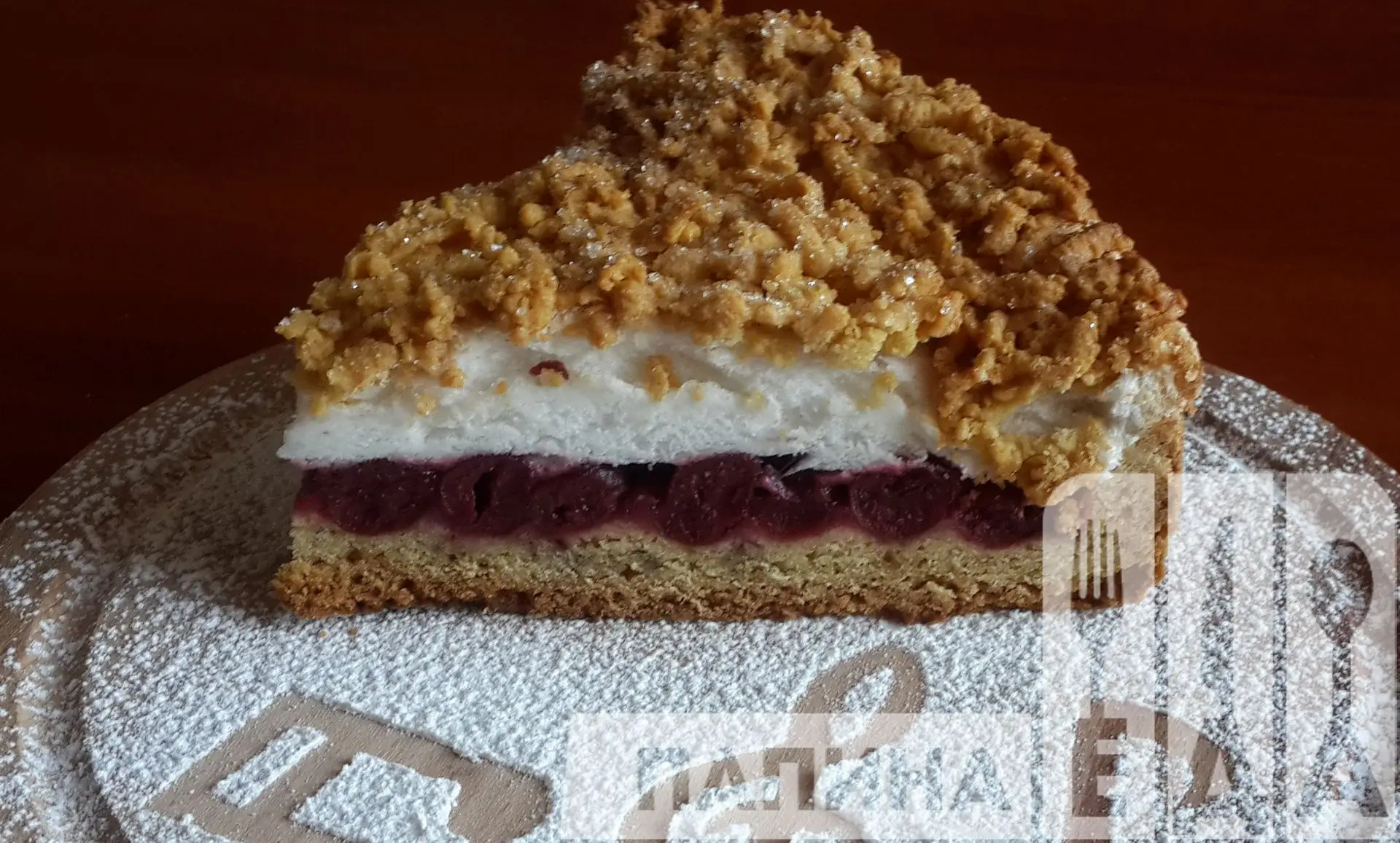 Вишню перемешиваем с сахаром и размещаем на основу. Отправляем немного запечься в духовой печи при 190-тах град, в течение 15-ти минут.