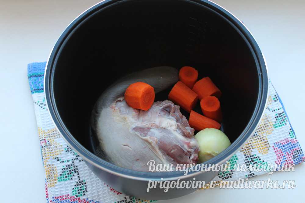 - Кладем целый язык в кастрюлю мультиварки, туда же отправляем предварительно очищенные лук и морковь. Резать овощи не нужно. Заливаем водой. Она должна покрывать язык полностью.