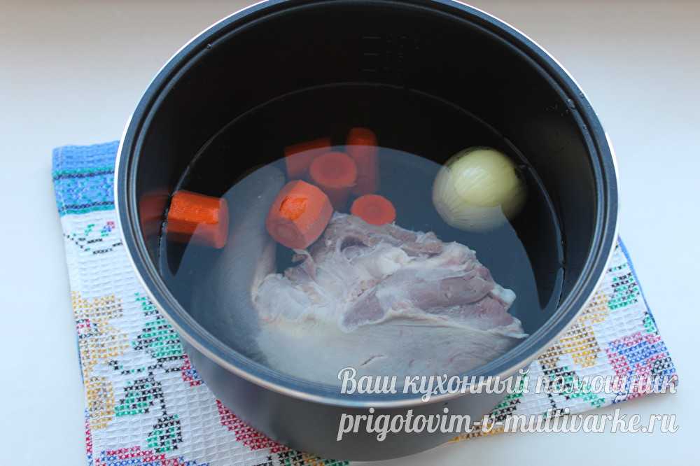 Наливаем в чашу мультиварки холодную воду. Она должна полностью закрывать содержимое. Выставляем на мультиварке режим «тушение», время приготовления – 2,5 часа.