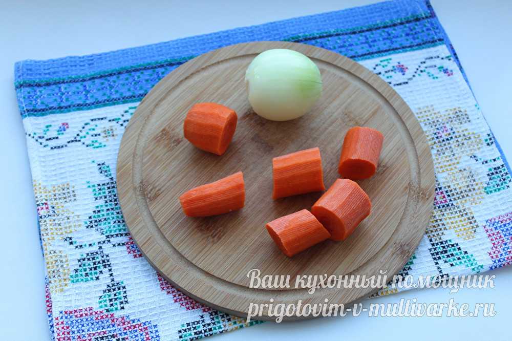 - Морковку с луком промойте и очистите. Морковку разрубите на 3 части, а лук оставьте целым.