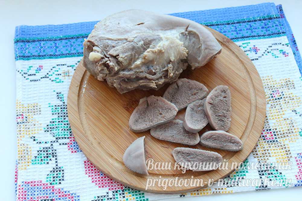 - Приготовьте язык по приведенному выше рецепту. Очистите его – в данном рецепте оптимальный вес языка указан в уже очищенном виде.