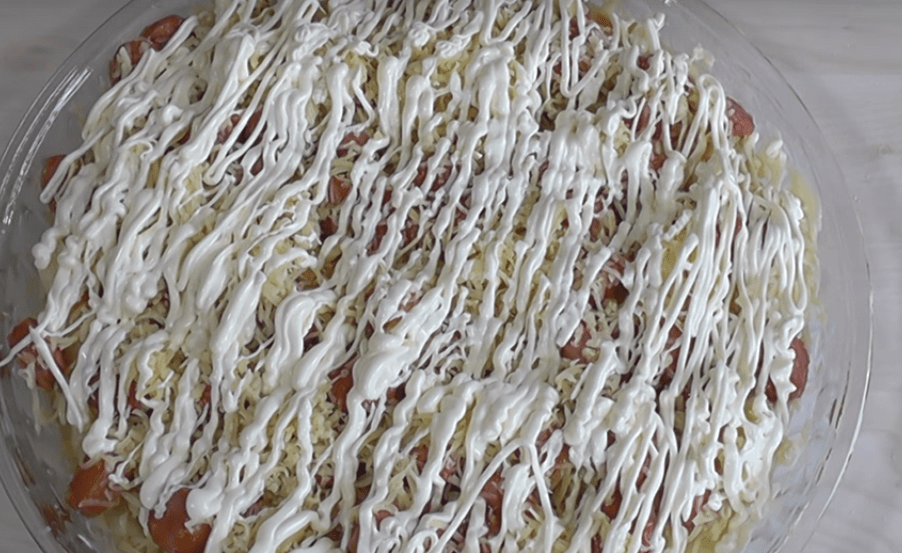 7. Потом идет слой оставшихся макарон, сыр, оставшиеся сосиски и снова сыр. Вот теперь все слои уложены и мы закрываем их майонезом.