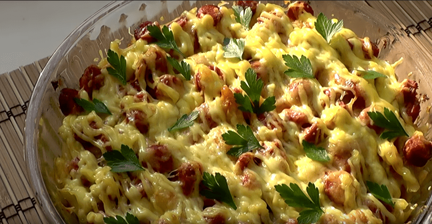 Быстрая запеканка из макарон с колбасой и сыром – рецепт с фото
