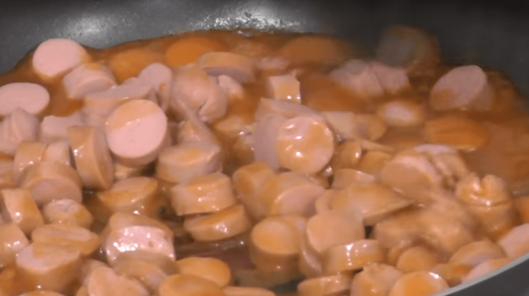 2. Обжариваем на сковороде нарезанный лук и сосиски, 2 минуты.