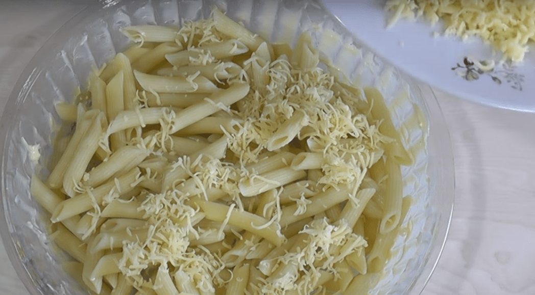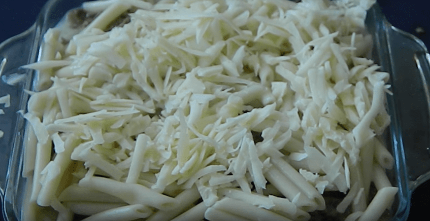5. Теперь берем форму для запекания, выкладываем на нее половину приготовленных варенных макарон и присыпаем их сыром.