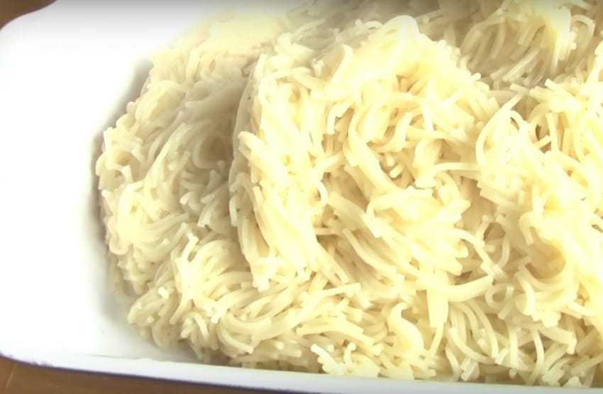 - Любые макаронные изделия отвариваются в соленой воде до готовности. Далее они выкладываются в форму, щедро смазанную сливочным маслом.