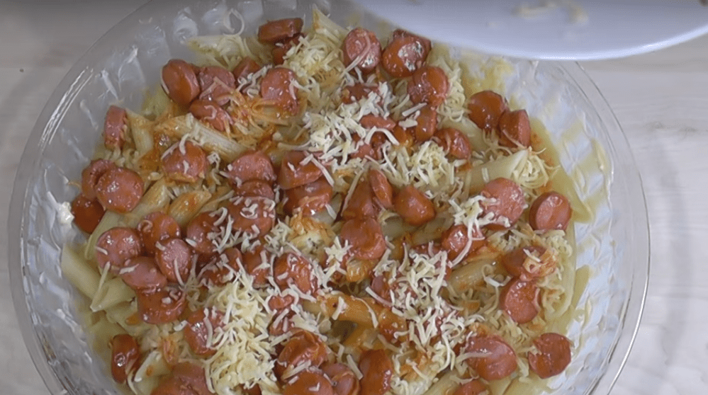 6. Потом идет «сосисочный» слой, который тоже надо присыпать сыром. Сосисок, как и макарон, кладем только половину из приготовленного.
