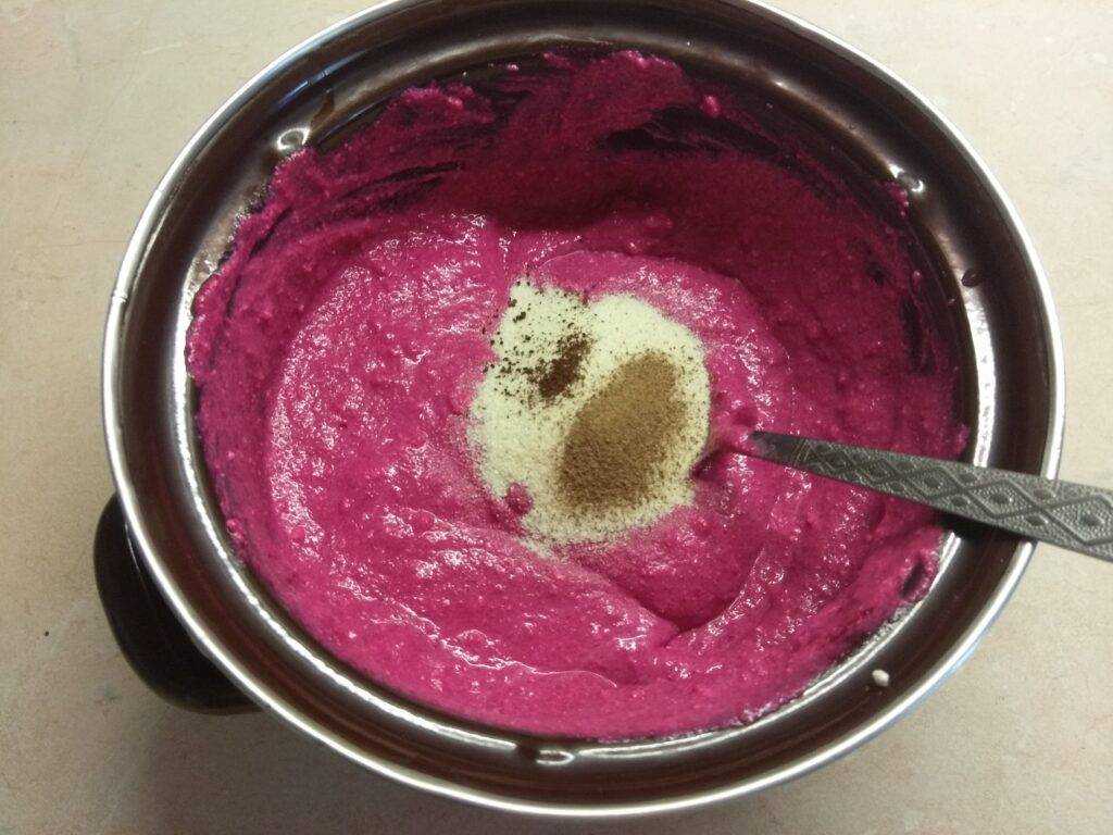 - Добавьте к фруктовому пюре творог, ваниль, манку и яичный белок.