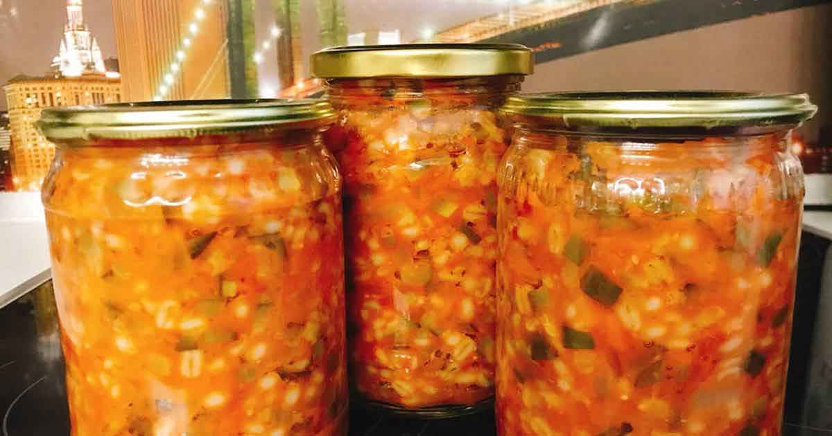 Доводим до кипения и варим в течение получаса на среднем огне. Затем выкладываем в кастрюлю перловку и уксус. Перемешиваем и сразу перекладываем заправку в стерильную тару и закупориваем металлическими крышками.