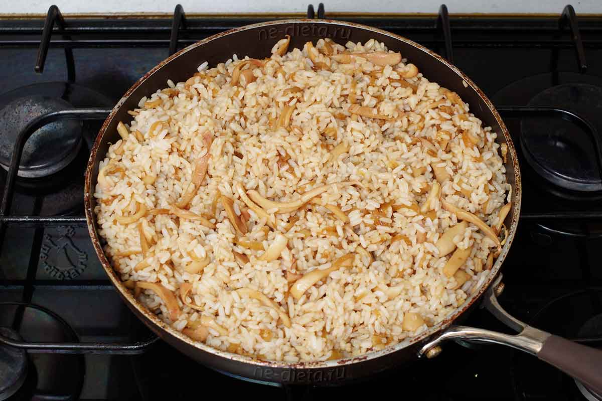 9. Через минуту огонь выключить, положить в сковороду отваренный рис и все очень тщательно перемешать.