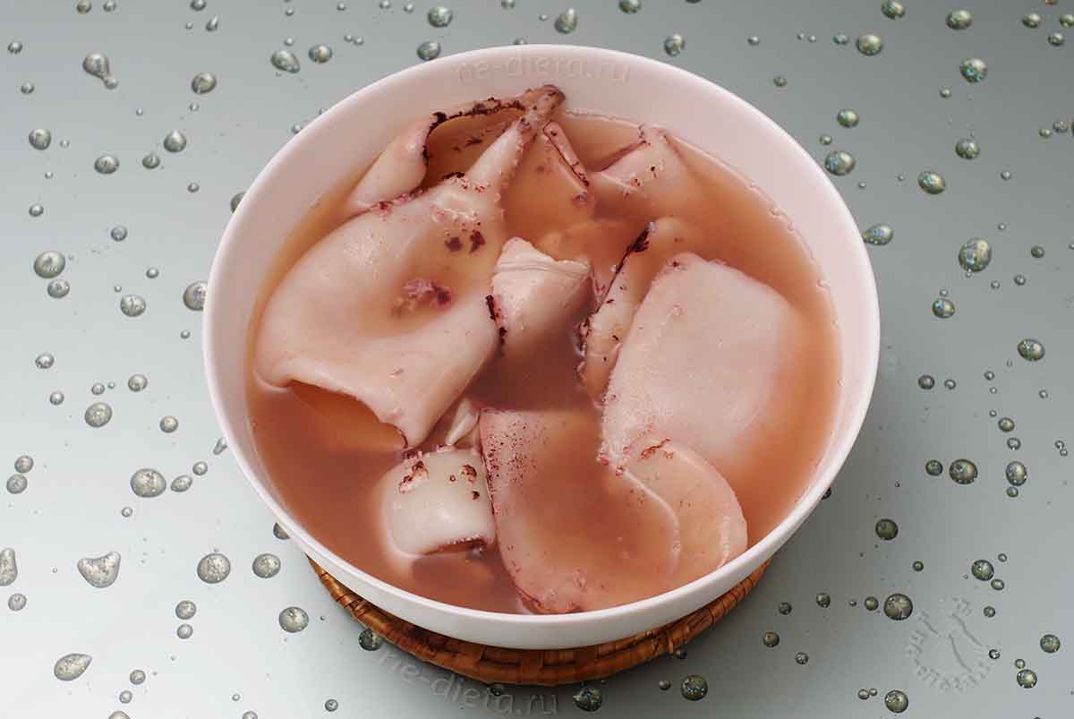 3. Кальмары лучше заранее разморозить, но если у вас мало времени, то можно просто залить их на 5 минут кипящей водой.