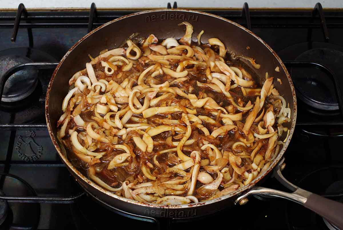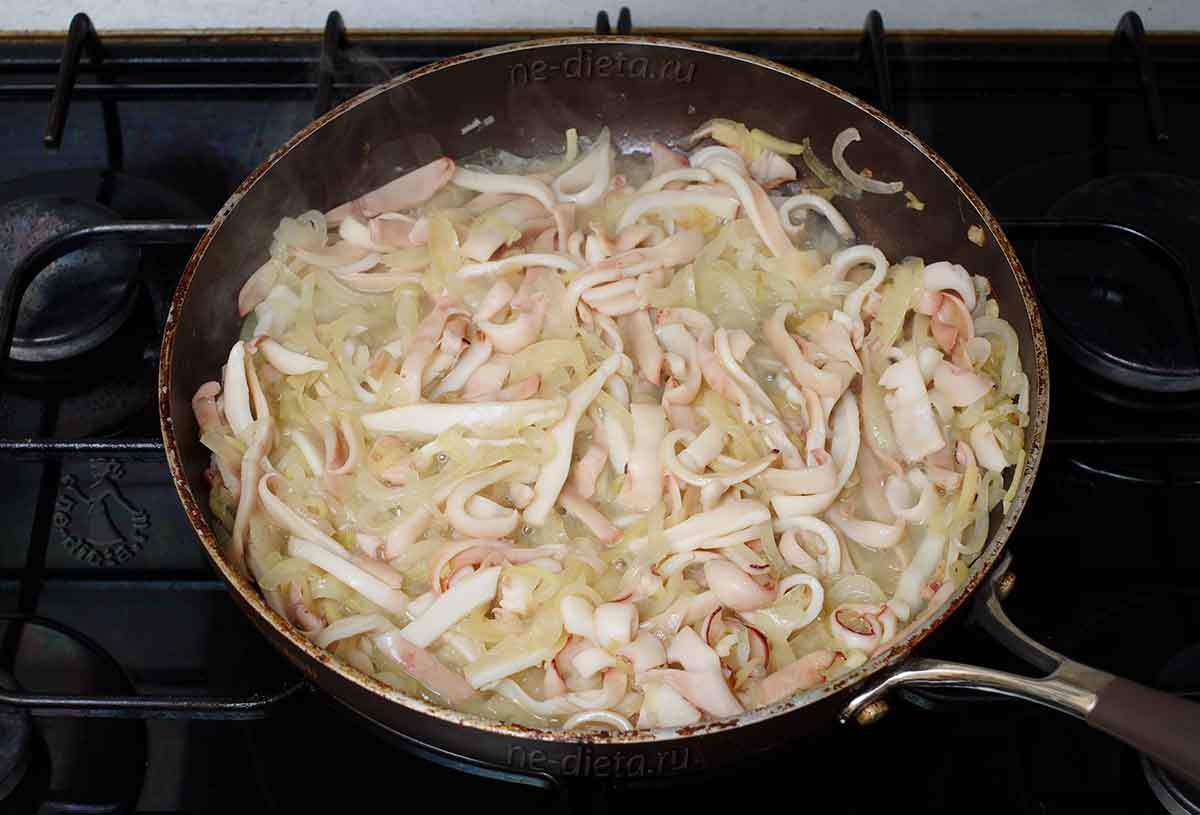 Рецепт приготовления кальмаров с жареным луком в сметане