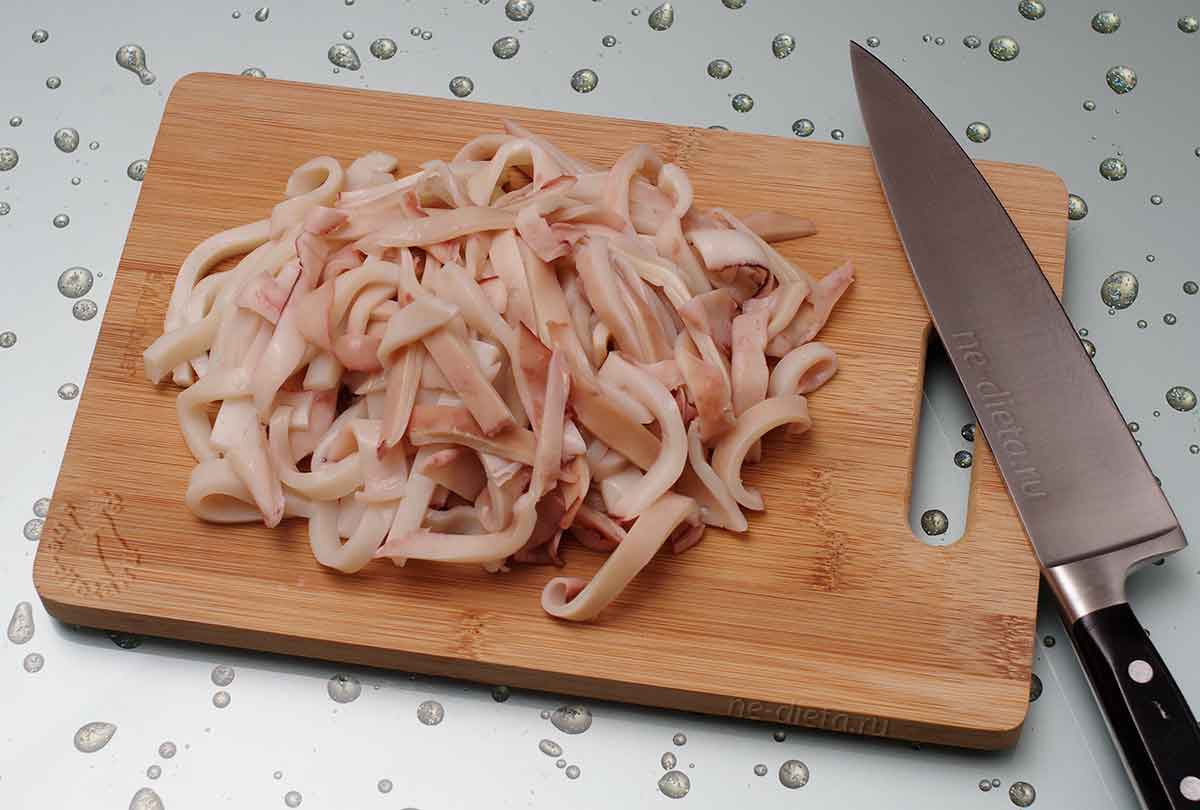 5. Подготовленные кальмары порезать длинными ломтиками средней толщины.