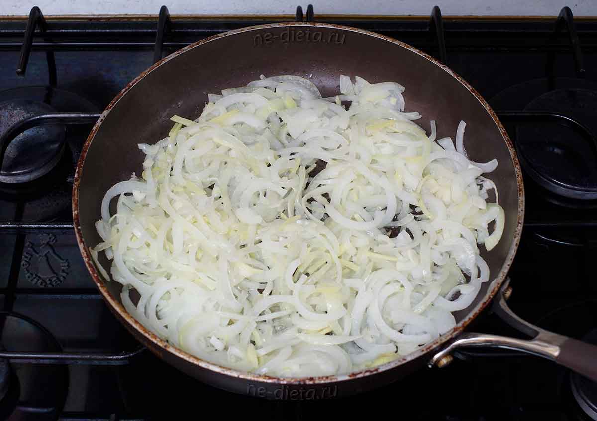 Лук почистите от шелухи и нарежьте тонкими полукольцами, можно порубить кубиком, как вам больше нравится. На разогретую сковороду налейте масла, а затем обжарьте на нем на небольшом огне лук до мягкости. Кусочки должны приобрести золотистый цвет.
