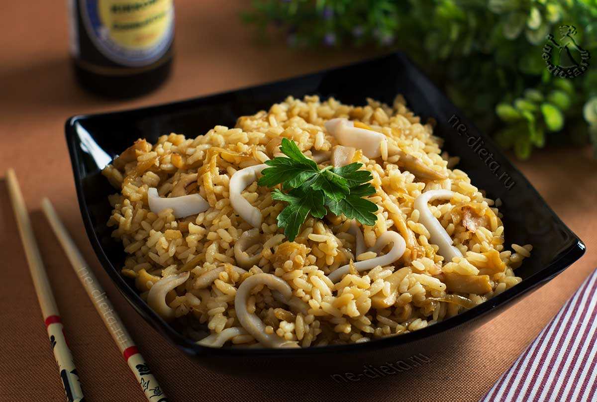 Очень удачный гарнир к жареной рыбе — рис с морепродуктами или кальмары с рисом и овощами. Кольца кальмаров с рисом – отличный гарнир или вкусное самостоятельное блюдо становится основным блюдом, почти как плов.