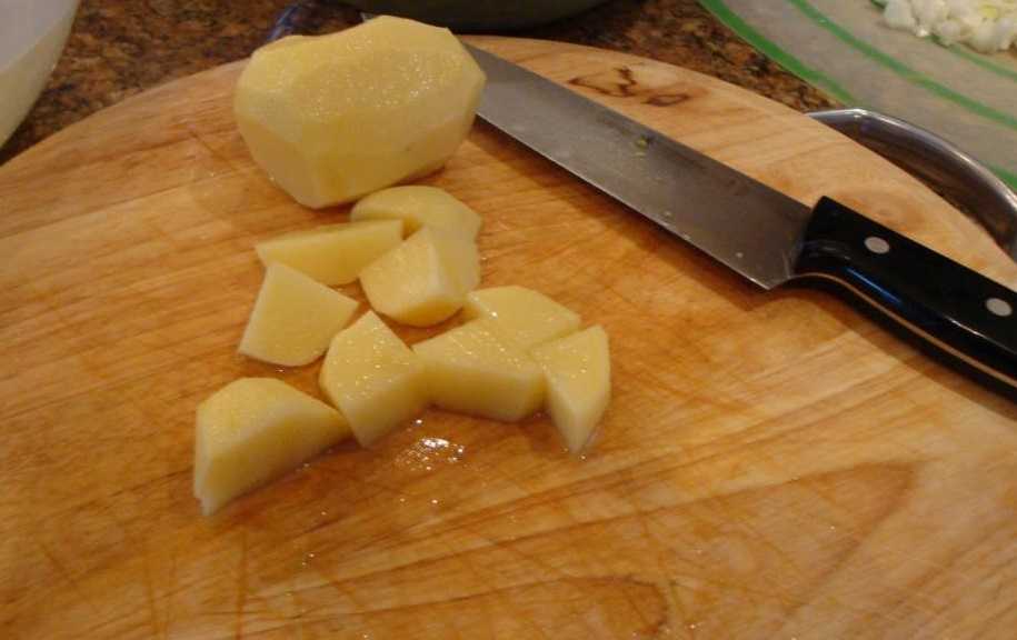 4. Режем картофель на крупные кубики, затем обжарить до еле заметной корочки.