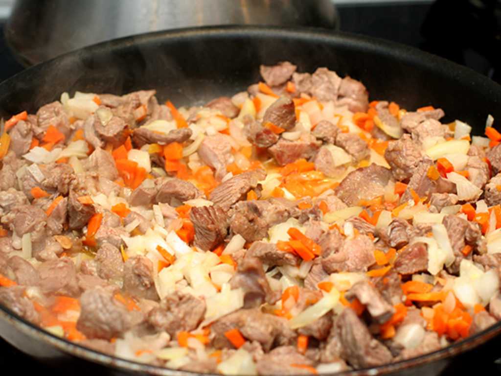 Говяжью мякоть необходимо вымыть, немного обсушить, порезать крупными кубиками, затем прожарить на подсолнечном масле до легкого зарумянивания. Когда говядина приобретет светло-розовый цвет, добавьте к ней лук и морковку, потушите еще на среднем огне, постоянно помешивая деревянной лопаткой минут 5-7.