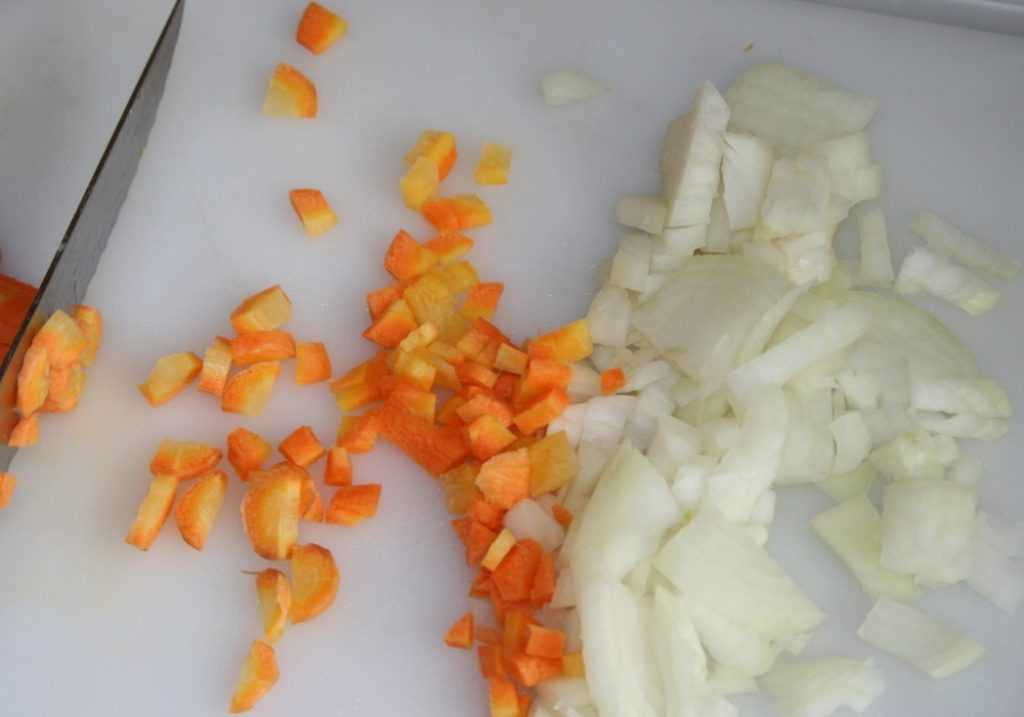 Морковку очистите, порежьте мелким кубиком или соломкой, а лучок измельчите острым ножом.
